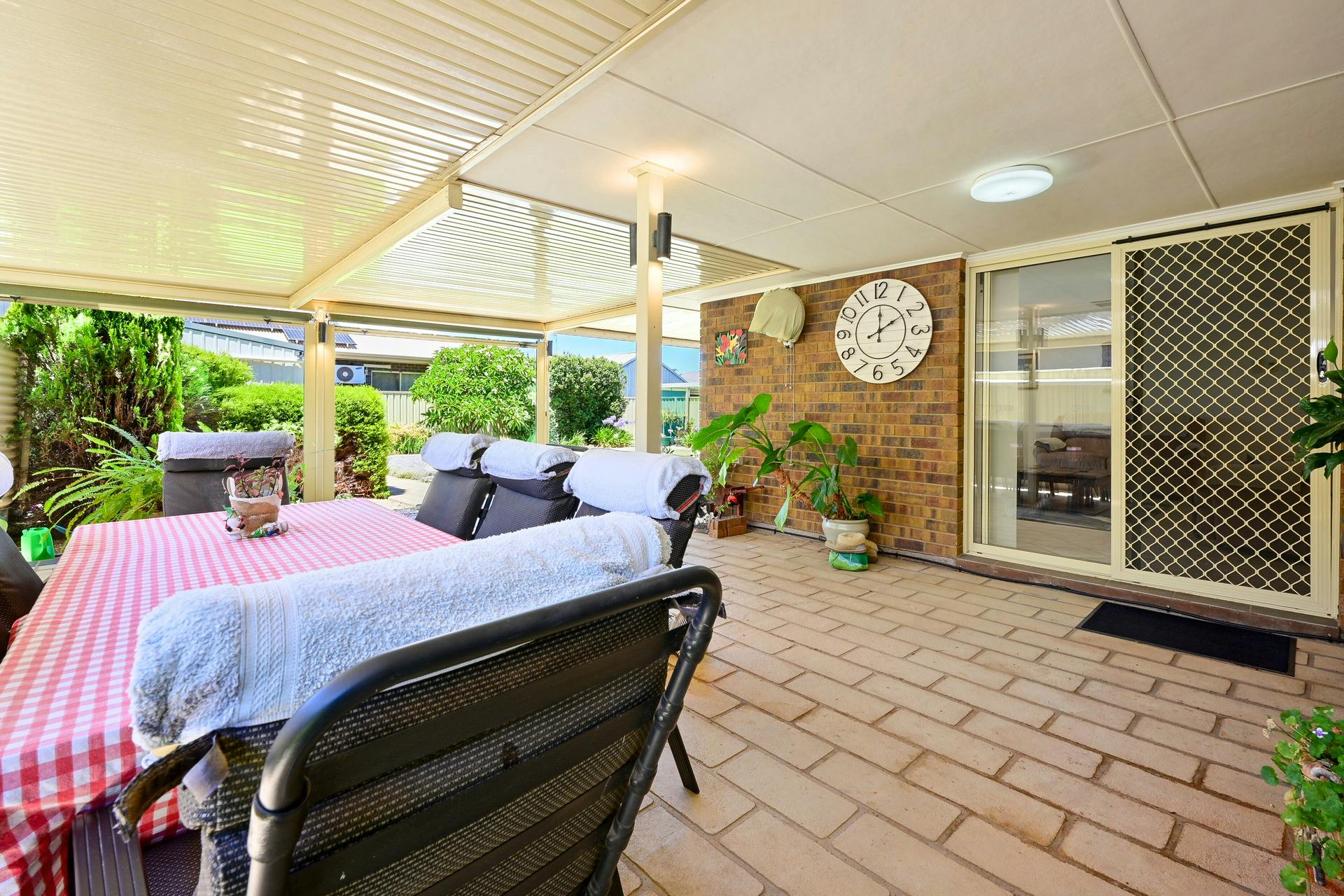 Paved undercover alfresco area ideal for entertaining, complete with pull-down blinds for sun protection